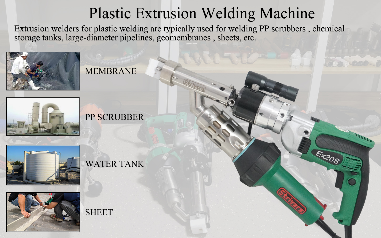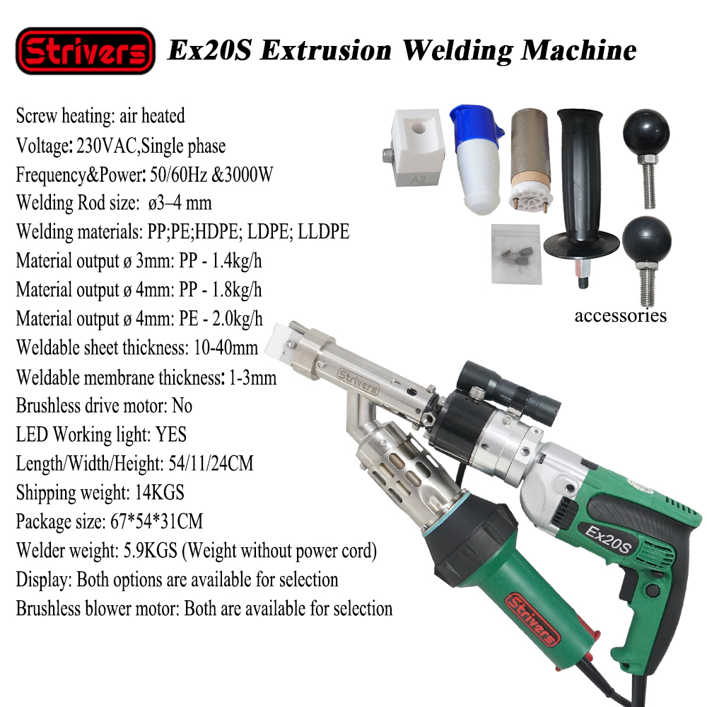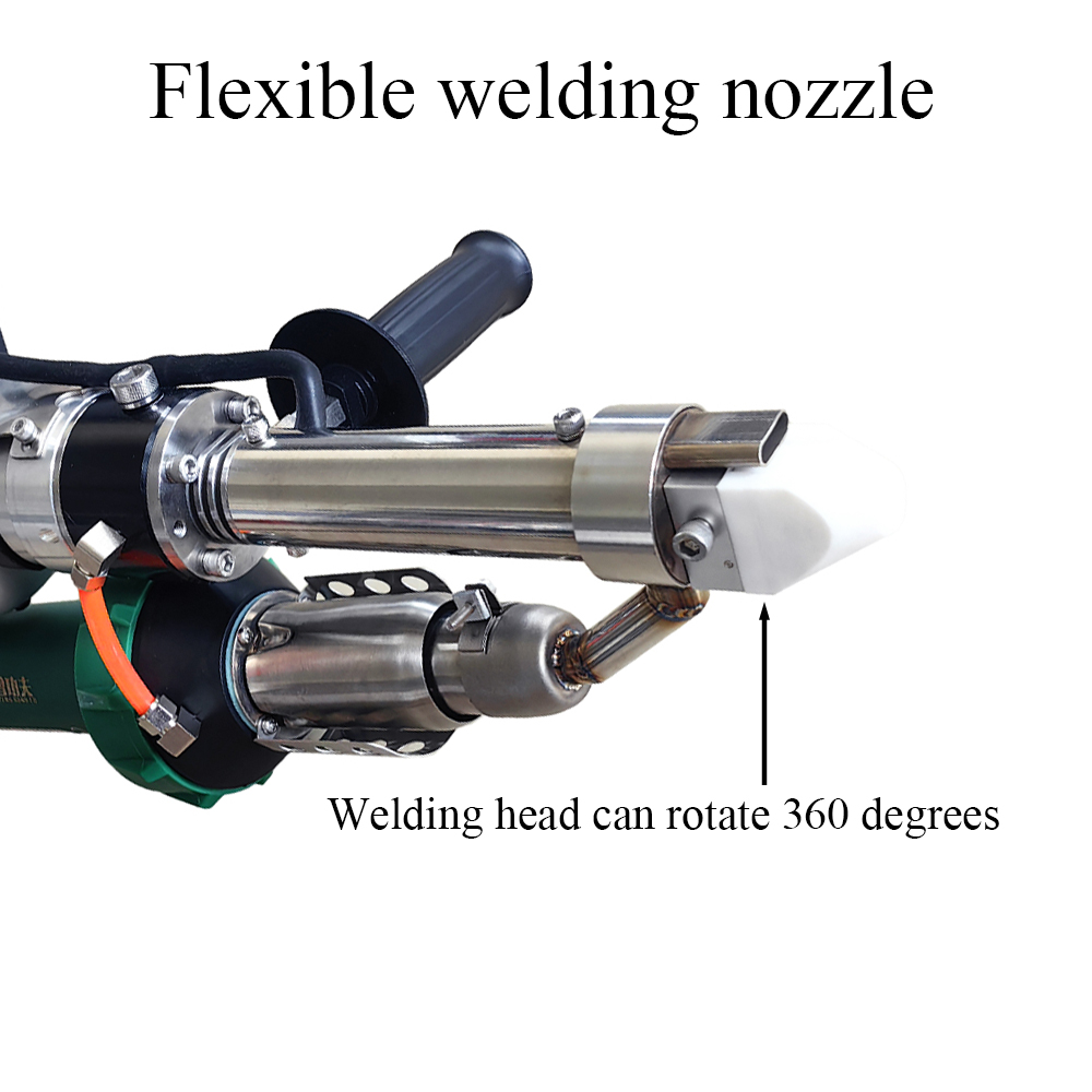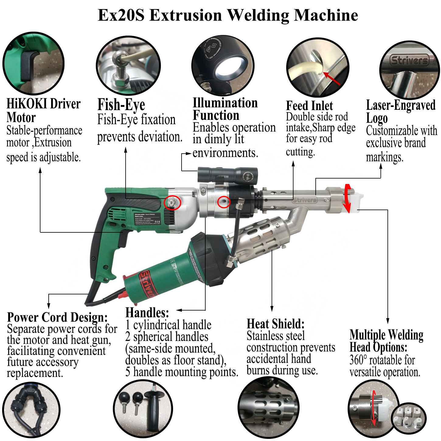 The EX20S is extremely compact, yet still powerful with 2kgs output. It's extremely durable, ergonomic and comes with countless ways to hold it. Due to the arrow-shaped body that narrows to a point, users may weld corners and difficult-to-reach places more easily than with traditional extruders. The guide for the pre-heated air is integrated into the end of the extruder, enabling the welding shows to be mounted in any position, rotating 360 °.