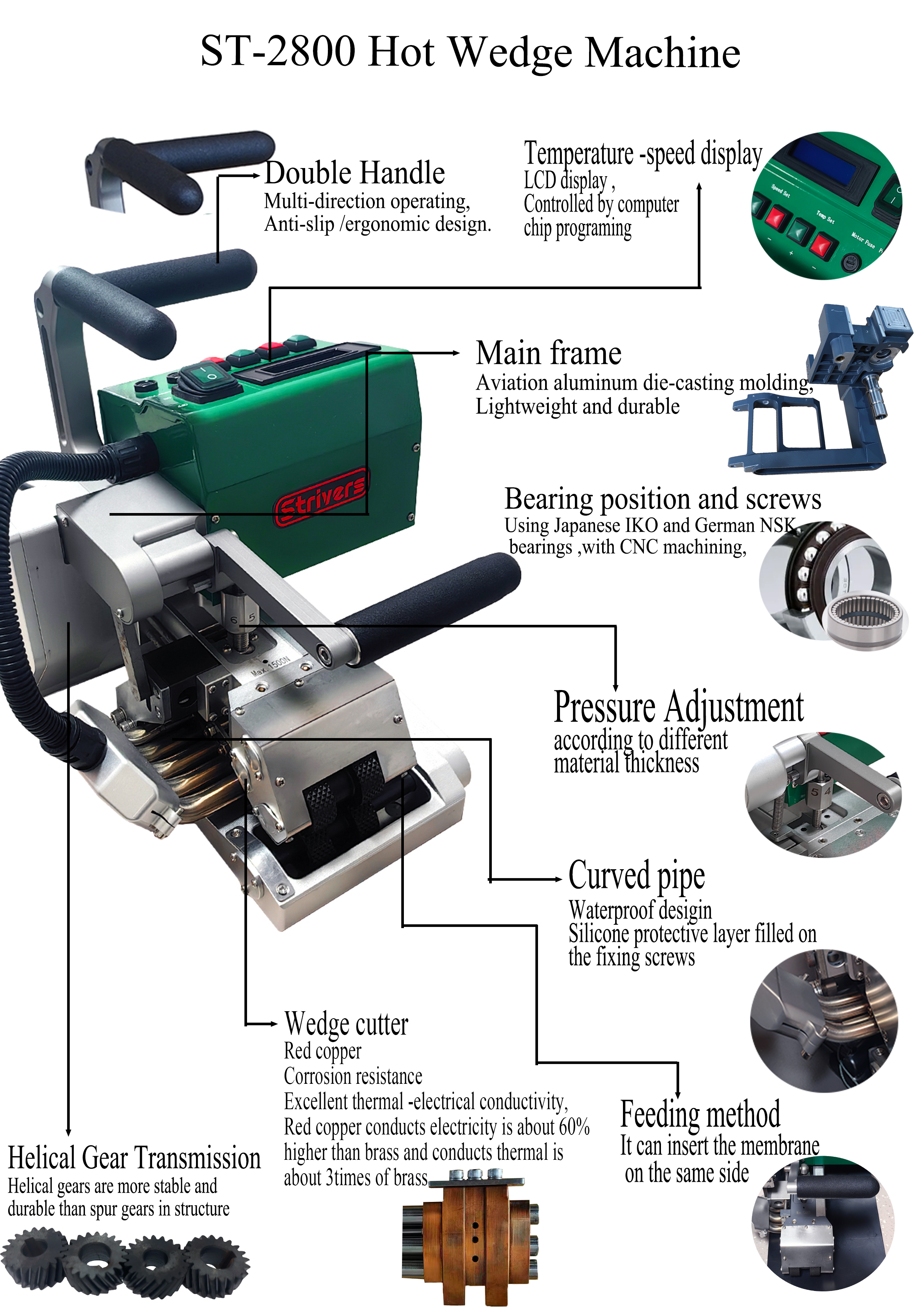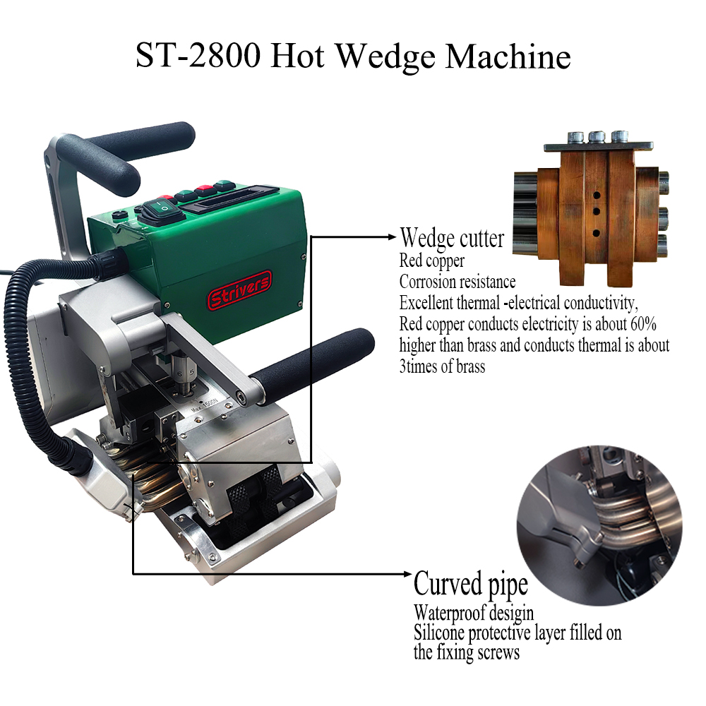 ST-2800 wedge welder is designed for the most demanding working siets in Landfill, Ponds-, Civil Engineering- and Tunnel constructions.Thermoplastic welding for the Geosynthetics Industry.The welder can weld geo-membrane of various thickness and are applicable for welding of all thermal-fused material such as LDPE, PVC,HDPE, EVA, PP.extensively used in engineering projects such as expressways, tunnels,reservoirs, waterproof of construction and so on.