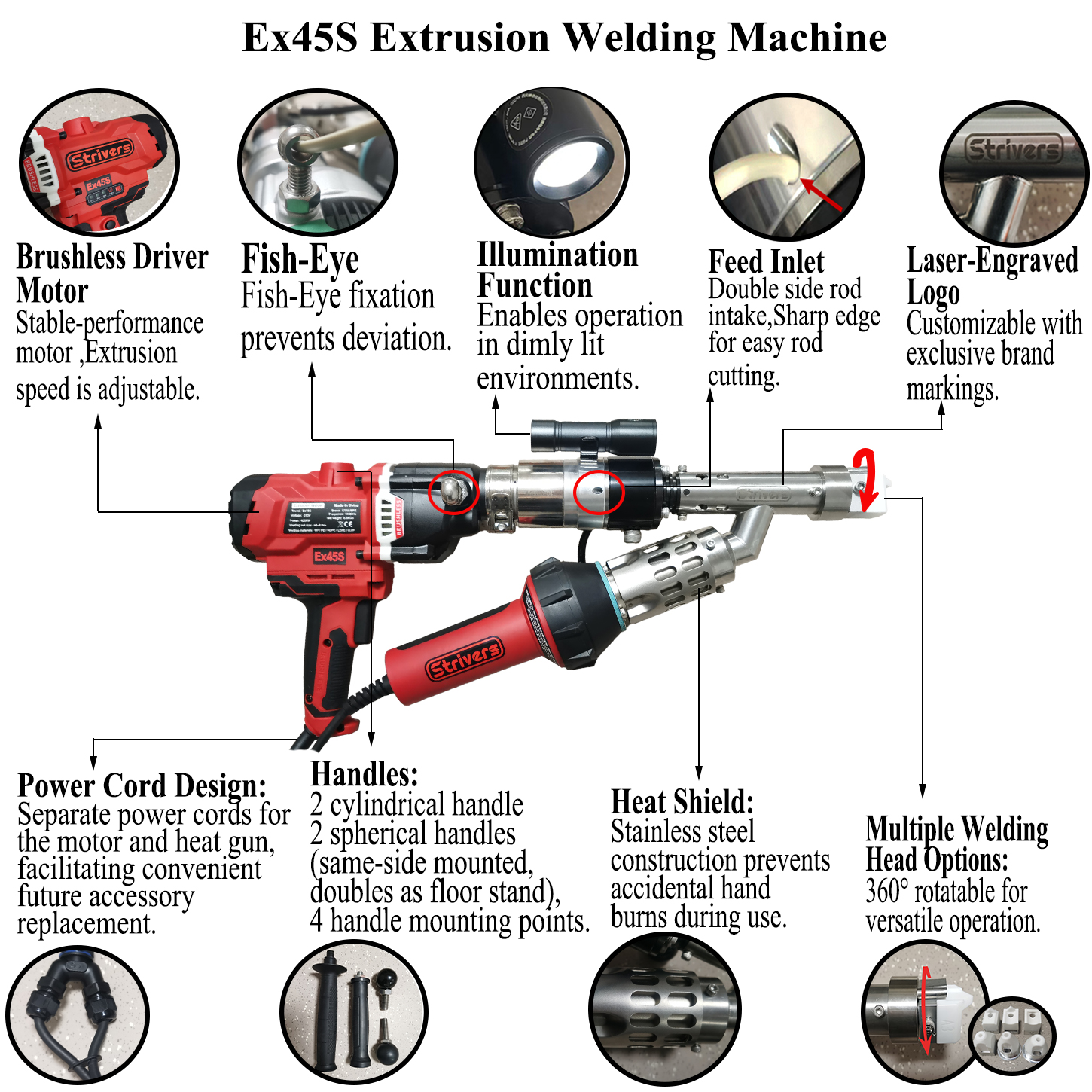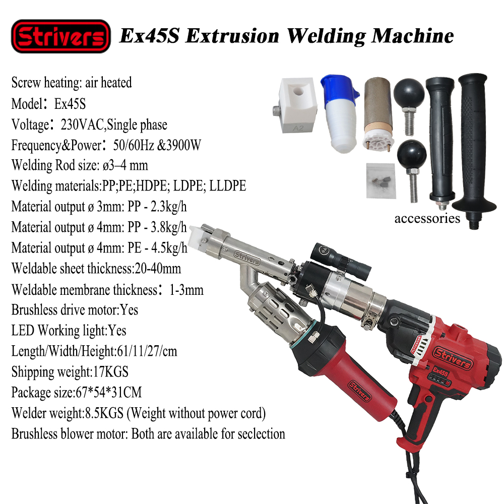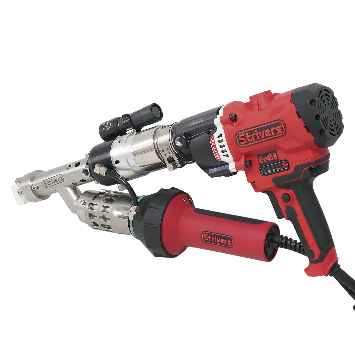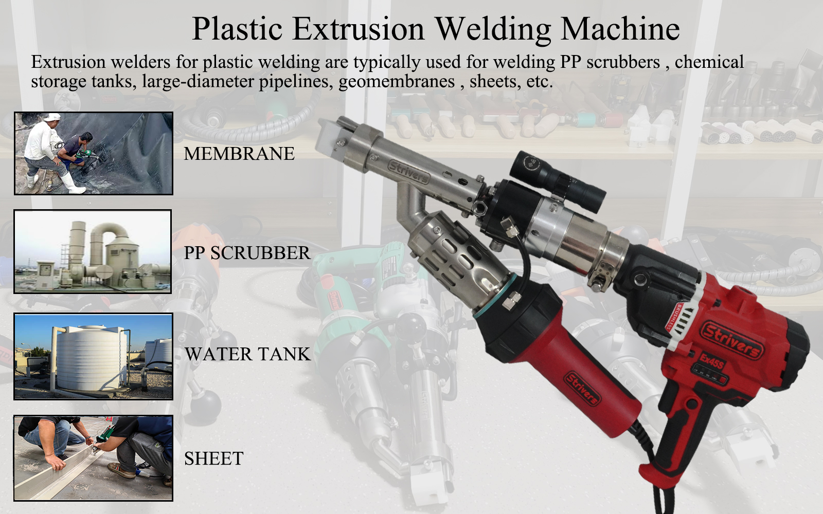 The EX45S is the most powerful hand extruder from our company. The ergonomically shaped extrusion welder convinces with 4.5 kg/h output for plastic welding in tanks and containers. our hand extruder is more flexibility when welding large objects made of polyethylene (HDPE) and polypropylene (PP). it can do tanks, electroplating tanks, water reservoirs, fish breeding tanks, flue gas scrubbing systems, pipelines, etc., for example.